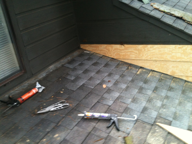 The shingles were applied on a slope too low for them to work without an underlayment designed for the slope; rotted wall siding above the area, and improper flashing in wall. Echols tech, Billy Dodd, installed a waterproof underlayment, put oversized wall flashing in and replaced wall siding.